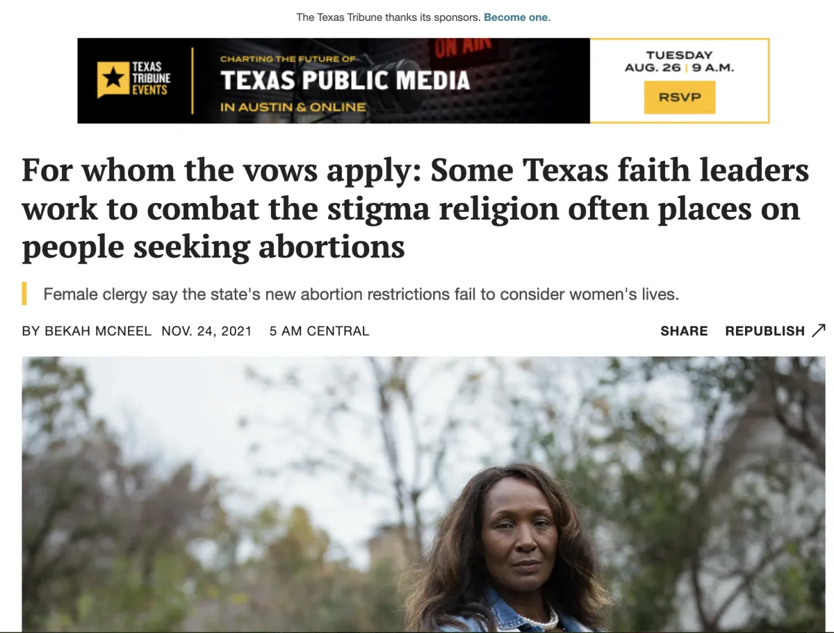 In November 2021, The Texas Tribune reported on Rev. Forbes' work in the reproductive rights movement.